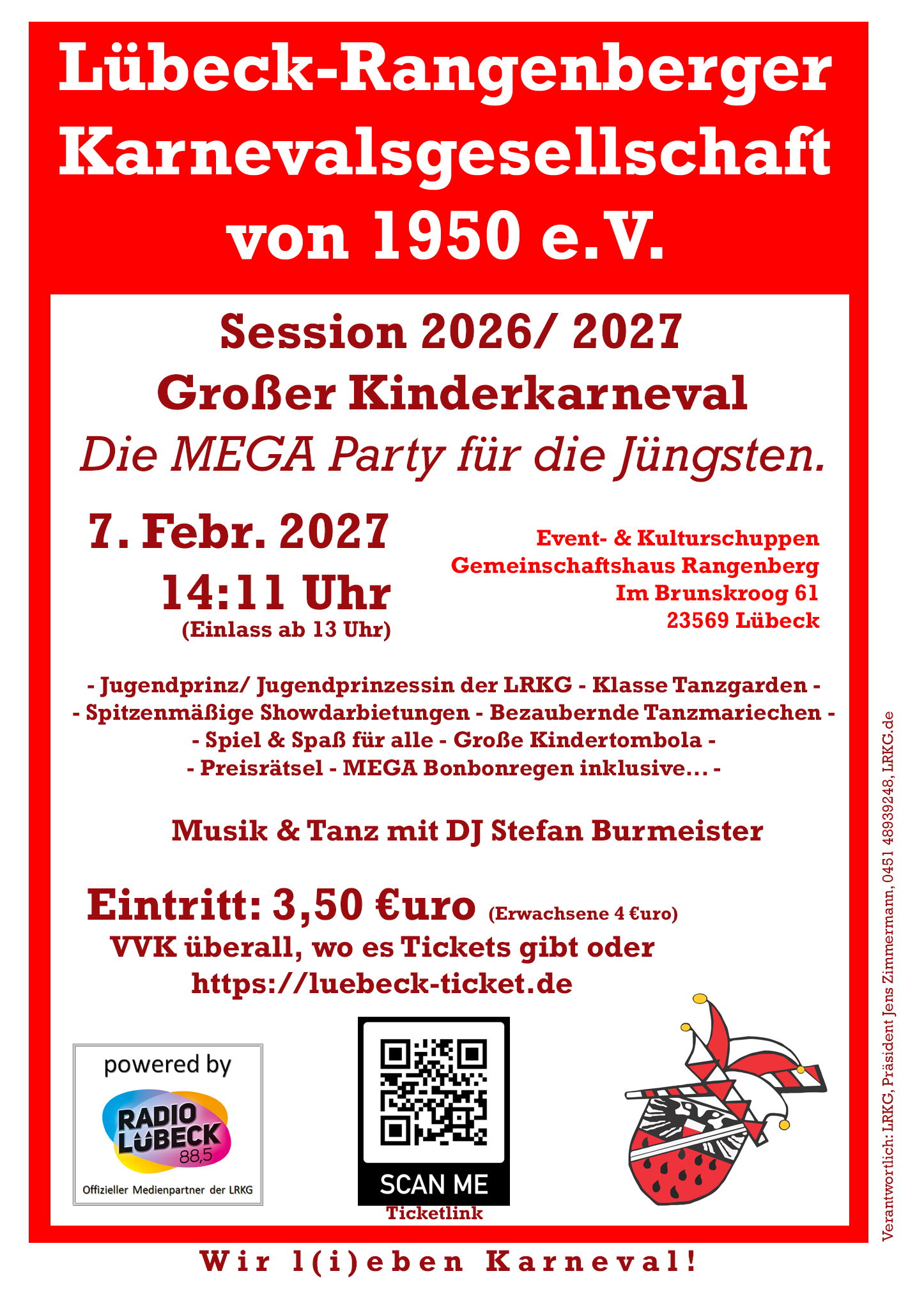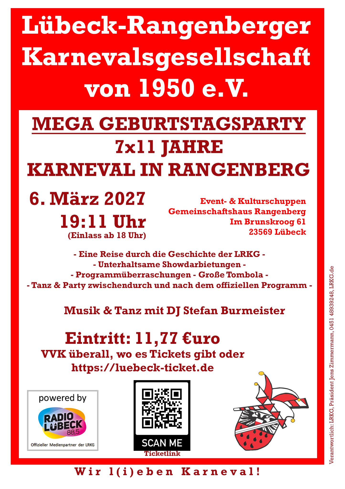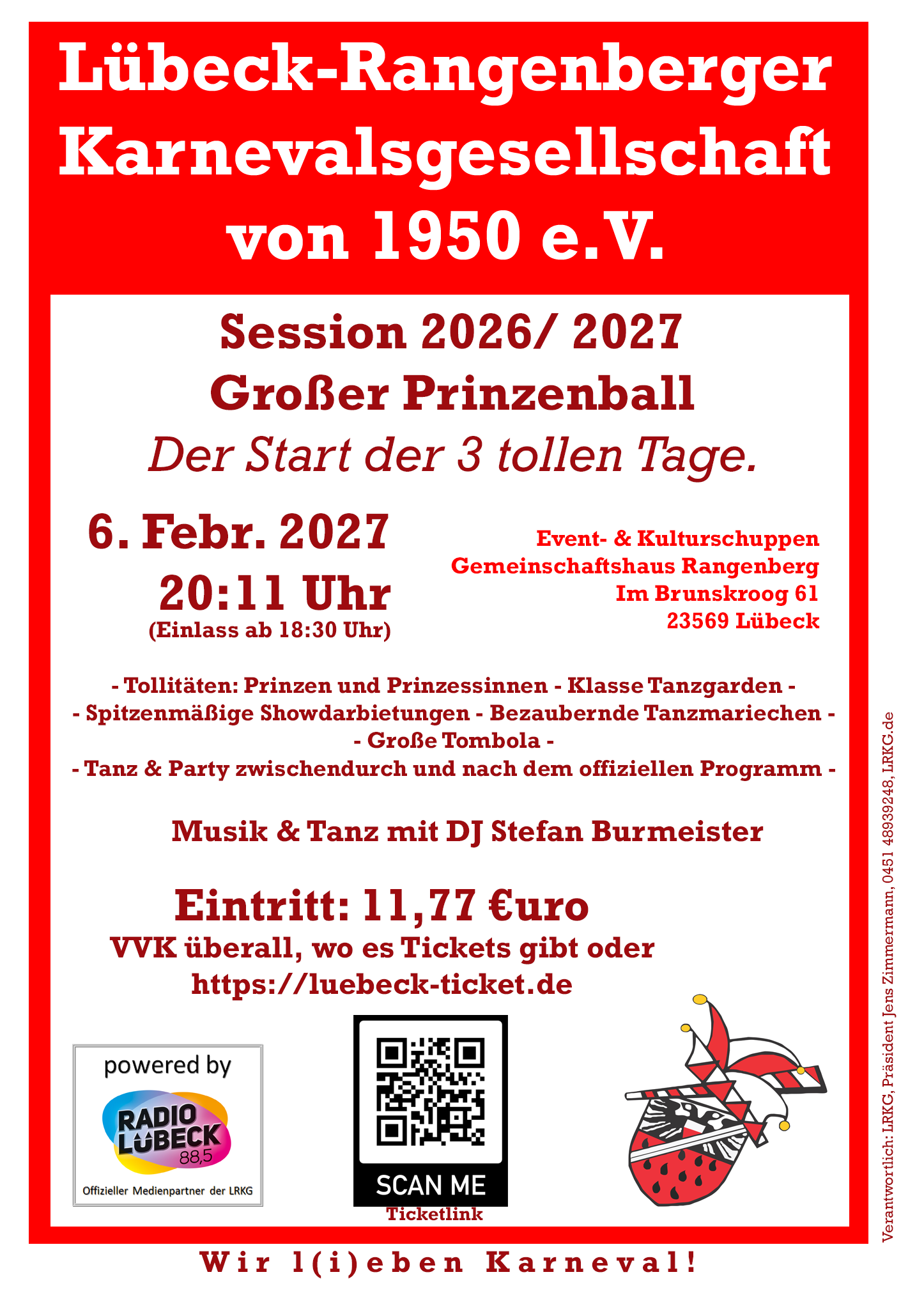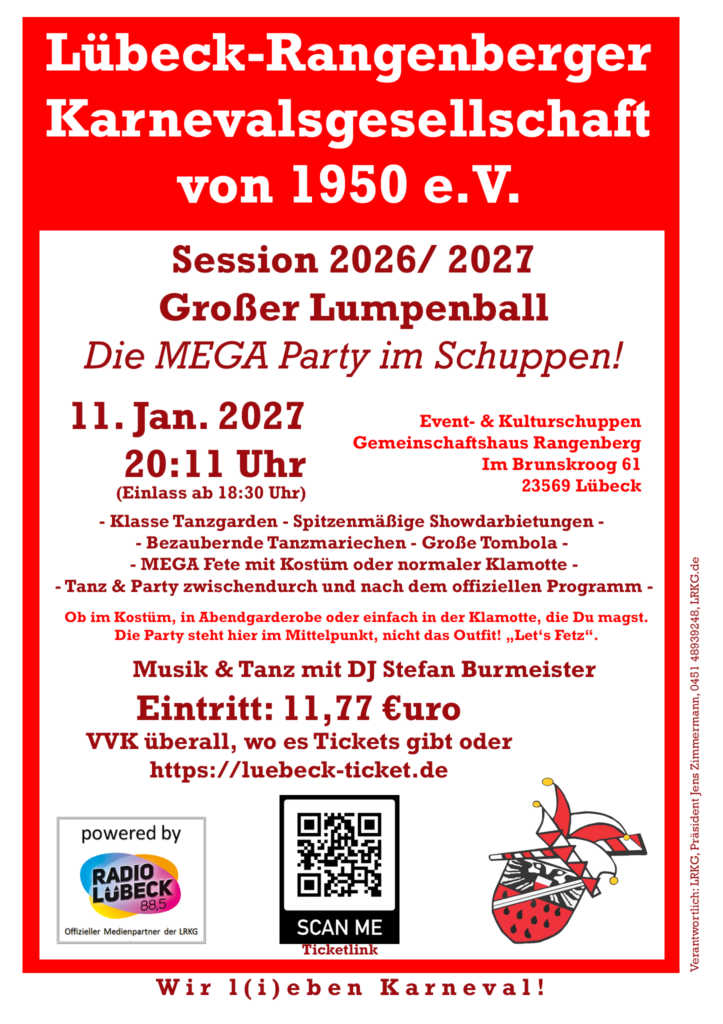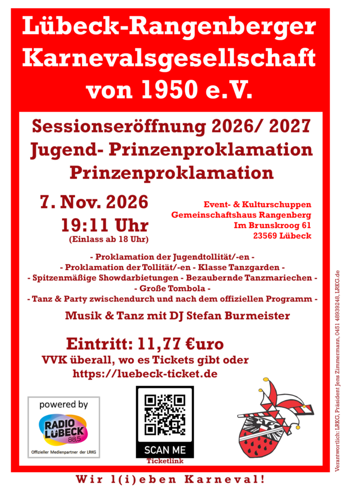 Nun beginnt dann auch bereits der Vorverkauf für die Veranstaltungen der LRKG in der Session 2026/ 2027, inkl. der großen Jubiläumsgala am 6. März 2027 im Event- & Kulturschuppen – Gemeinschaftshaus Rangenberg. Am 1. April ist das VVK- Portal bei Lübeck- Ticket freigeschaltet. Alle Direktlinks zu den Veranstaltungen hier auf dieser Seite unter Veranstaltungen.